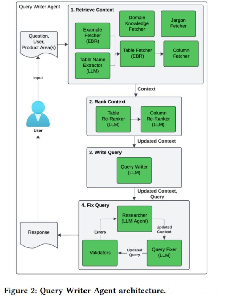 Using this approach the team was able to dramatically boost the relevance and accuracy of the responses. We can see this workflow in Figure 2, and the query writer agent has four main steps, retrieving the context, ranking, writing the query, and fixing the query. This process can loop multiple times based on any errors or hallucinations.