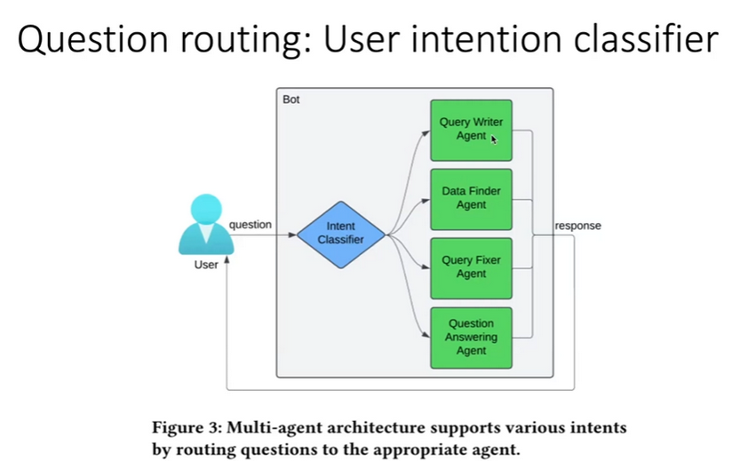 Lastly, in Figure 3, we see the user interface and high-level architecture for the chatbot type experience the team developed. Using a “Classifier”, the chatbot is able to define the user’s intent, and route the prompt to the appropriate agent.